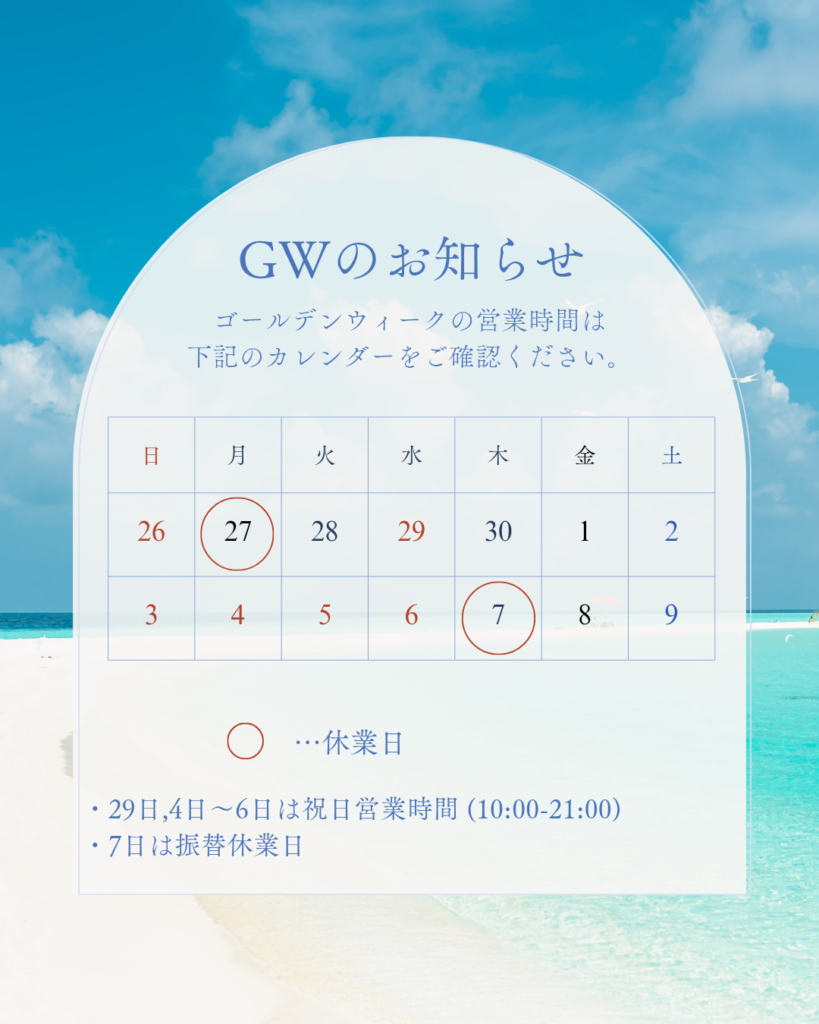 GWの営業時間はカレンダー通りとなります。